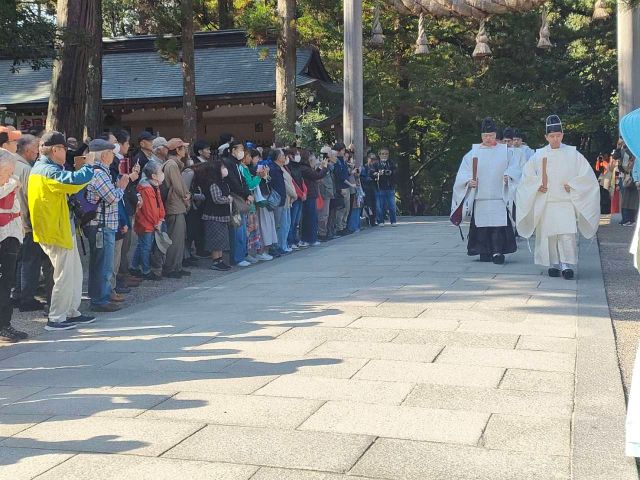 拝殿での神事ののち、引き続き関係者が摂社の活日神社に参進し、正式参拝します。