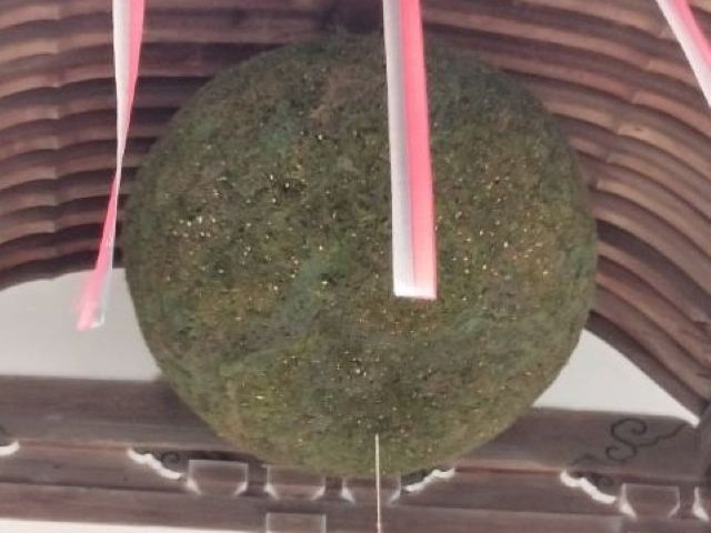 拝殿の向拝(こうはい)には前日に掛け替えられた真新しい「大杉玉」がかかっていました。直径1.5メートル、重さは約200㎏もあるとても巨大なもので、職員の方が滑車を使って掛けるそうです。神事のあとには酒造関係者にも、新しい杉玉が授与されました。
