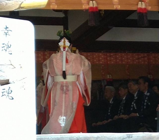 神事の途中で、四人の巫女が三輪の神杉を手に「うま酒みわの舞」を舞います。この神楽では「この神酒(みき)は 我が神酒ならず 倭なす 大物主の 醸(か)みし神酒 幾久(いくひさ) 幾久」という歌が歌われます。これは、後ほどお参りする活日(いくひ)神社のご祭神となっている高橋活日命(たかはしのいくひのみこと)がおいしい神酒を醸造した際に、大物主のご神徳を讃えて天皇に捧げた歌といわれています。