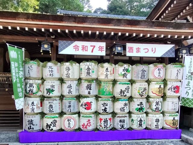 ここで始まった酒造りは各地に広まり、古代の歌にも三輪にかかる枕言葉は「うまさけ」と詠まれて称えられています。こうしたことから大神神社は酒造守護の神様を祀る神社として崇敬をうけ、今も全国の酒造関係者が参拝しています。