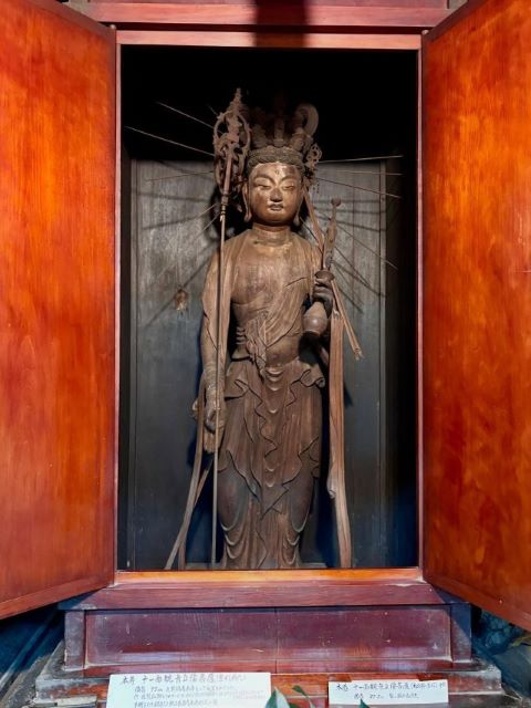 ヒノキの寄木造りの木造十一面観音立像。明治時代初めごろに廃寺となった鹿野園町の梵福寺(ぼんぷくじ)の本尊と伝わります。(「大和誌」では岩淵寺の子院との記載あり)。像高は100cm足らずですが、右手に錫杖を執り、左手に蓮華茎を挿した水瓶を握る長谷寺式十一面観音菩薩です。頭上にいただく十面の配列は乱れていますが、後補(後世の補修)は一面だけです。眉や唇に彩色するほか素地仕上げです。白毫と眼には水晶がはめられています。眉と眼が大きく、しかも吊り上がっており、精悍なお顔です。撫で肩で上半身が少し長め、いわゆる胴長ですが、腰を左にひねって左足を軸足にして両足先を外に開いてお立ちで、安定感のある表現です。横から見ると全身が少し前に傾斜しているのが特徴です。