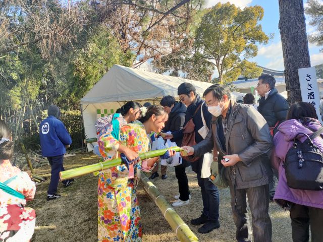 笹娘さんは近くのきもの専門学校や日本語学校の生徒さんたちです。ミャンマーやスリランカからの留学生もおられたようです。笹娘さんの後方では、男性スタッフが竹筒にいれた笹酒を、焚火でお燗をしていました。今日のような寒い日には、温かい笹酒が身に沁みます。