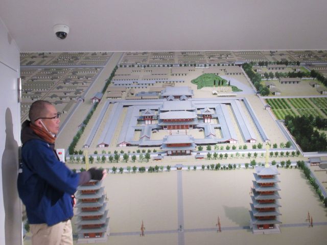 大安寺は、聖徳太子が平群郡額田部に熊凝精舎を創建したことに始まると言われ、その後百済大寺、高市大寺、大官大寺と寺名と所在地が変わり、平城京に遷都して大安寺となりました。宝物殿で係員が創建当時の復元図の説明をされていましたが、現在の境内とは比較にならないくらい広く、東西に七重塔が建っており、その塔跡が現在も残っています。