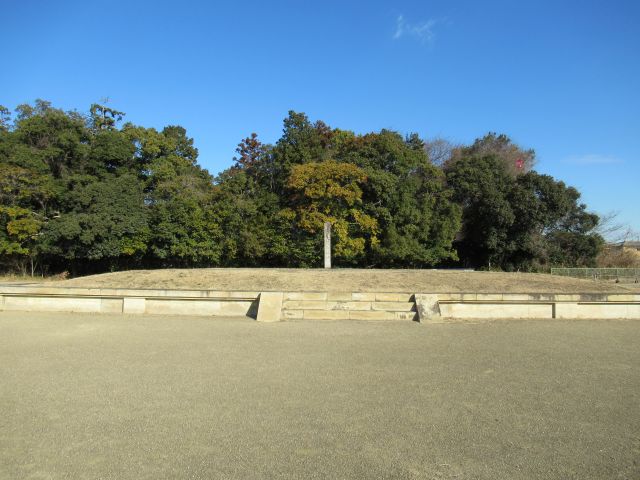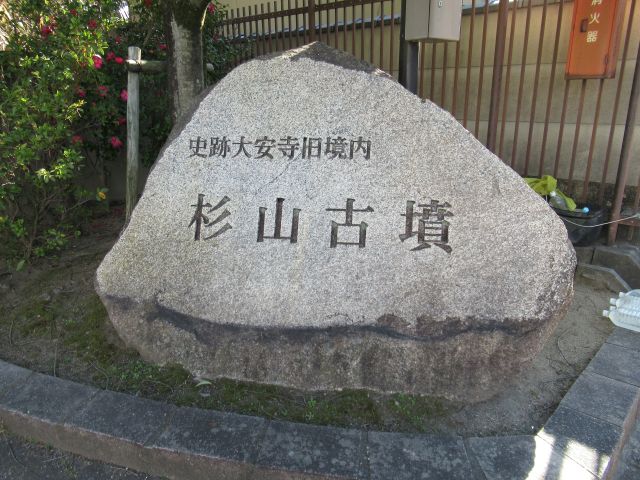 旧境内の北東部分には、5世紀後半に築造された前方後円墳の杉山古墳がありますが、この古墳は平城京造営時に破壊をまぬがれた数少ない古墳のひとつです。旧境内の隅にあったため、「隅山」がなまって「杉山」になったと考えられているようです。残念ながら当日は古墳公園の休園日(月・水・金曜)にあたり、園内に入ることはできませんでした。