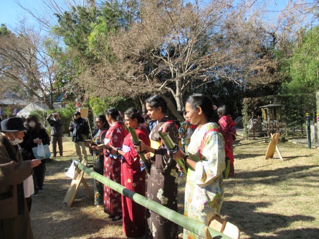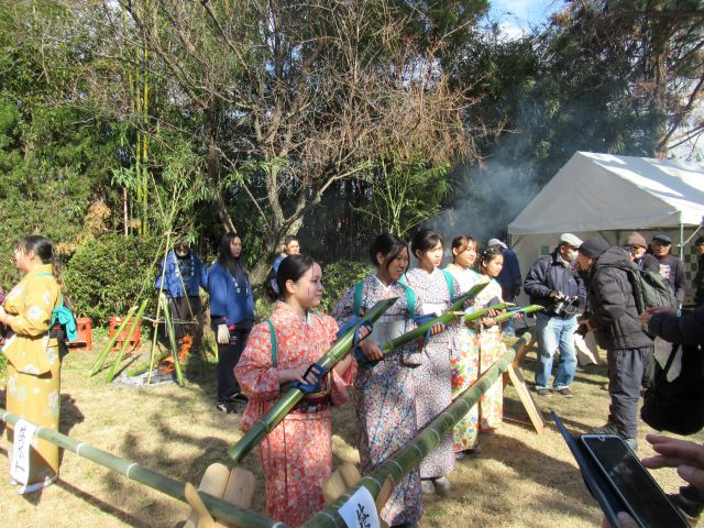 笹娘さんは近くのきもの専門学校や日本語学校の生徒さんたちです。ミャンマーやスリランカからの留学生もおられたようです。笹娘さんの後方では、男性スタッフが竹筒にいれた笹酒を、焚火でお燗をしていました。今日のような寒い日には、温かい笹酒が身に沁みます。