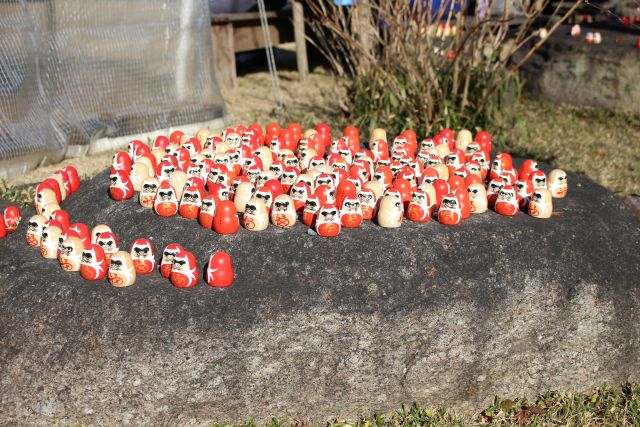 境内のあちらこちらに小さなダルマが飾ってあるのが目につきます。このダルマは木で作られたおみくじの容器で、おみくじを引いた人が、残していかれるようです。