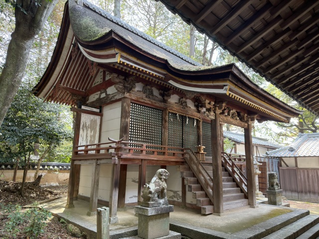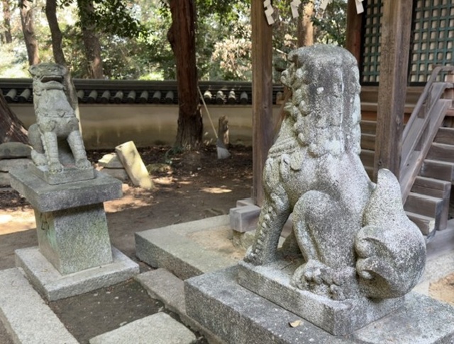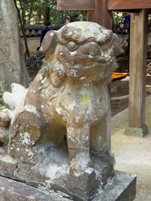 途中の休憩時に普段は間近で見ることができない狛犬を、じっくりと拝見しました。本殿前には、鼻が大きく、口が縁どられ、尻尾は胴に張り付いた扇型の「浪花型狛犬」、若宮社前には、東大寺南大門の狛犬を摸した狛犬が鎮座しています。南大門の狛犬は尻尾がないのですが、こちらには尻尾がきちんと付いています。