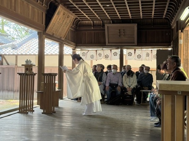 作業の前に拝殿で安全祈願のご祈祷をしていただきました。宮司さんによるお祓い、祝詞の後、当グループの本井良明代表(理事)も玉串をささげました。