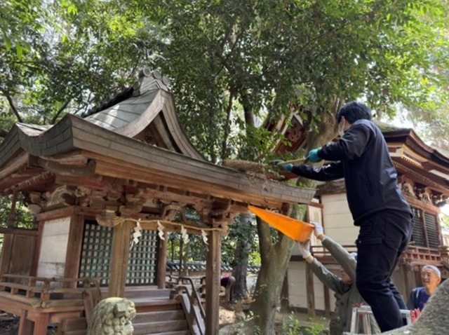 宮司さんのご希望で、若宮社の銅板葺の屋根に積もった落ち葉を、保存継承グループのメンバーが脚立を使って身軽に掃き清めました。
