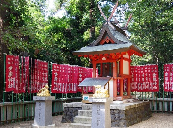 金龍(きんりゅう)神社は春日大社の末社の一つです。境内の若宮の南方に、寄進された多くの赤い幟旗(のぼりばた)に囲まれて鎮座しています。