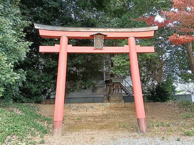 国道169号の東、孝元天皇剣池嶋上陵(こうげんてんのうつるぎいけのしまのえのみささぎ)のある石川池(剣池)の西側にある住宅地の中、花園神社は小さな杜(もり)の木々に囲まれて鎮座しています。南向きに朱色の鳥居があり、少しの土の高まりに西向きの小さな祠(ほこら)があります。