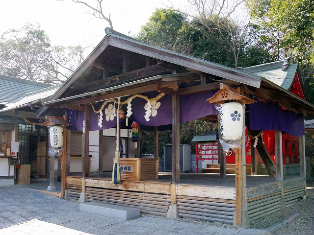 大みそかから正月三が日は笹(ささ)酒のふるまいがあり、1月第2日曜の大とんどでは、神社すぐ下の池のほとりでのおたき上げが名物。桜の時期には、境内とあやめ池新橋のちょうちんに灯がともされ、夜桜が水面に映え、参拝者でにぎわいます。