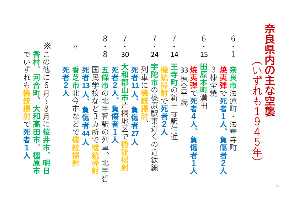 戦後の1949年に政府の経済安定本部調査課が発行した「太平洋戦争による我国の被害総合報告書」では、県内の空襲による被害は死者68人、重傷90人、軽傷32人の計190人となっています。空襲の件数は記録されていません。2022年に帝塚山大学の末吉洋文教授とゼミ生が市町村史、学校史などを克明に調査して作成した「奈良県戦跡デジタルマップ」を公表し空襲は90件、死者は40人が確認されたとしています。
