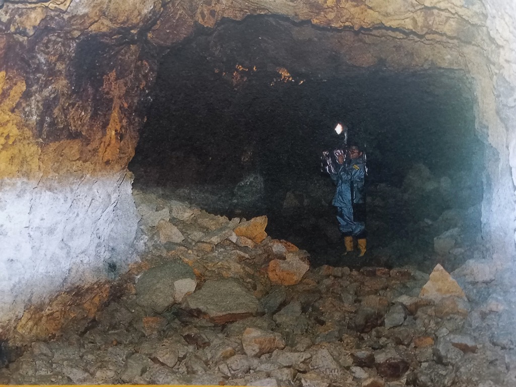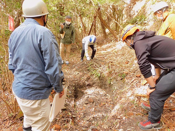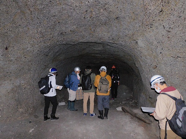 地下壕は西壕と東壕に分かれ、それぞれ構造はあみだ状で、幅約5㍍、高さ約3㍍で掘削され、延長は約1㌔です。地元のNPO法人が2021年の調査で、西壕近くの傾斜地の3カ所で建物跡を発見し、出土したタイルや小便器などから建物は陸軍幹部の皇族用や航空総軍司令官用ではないかと推測しています。