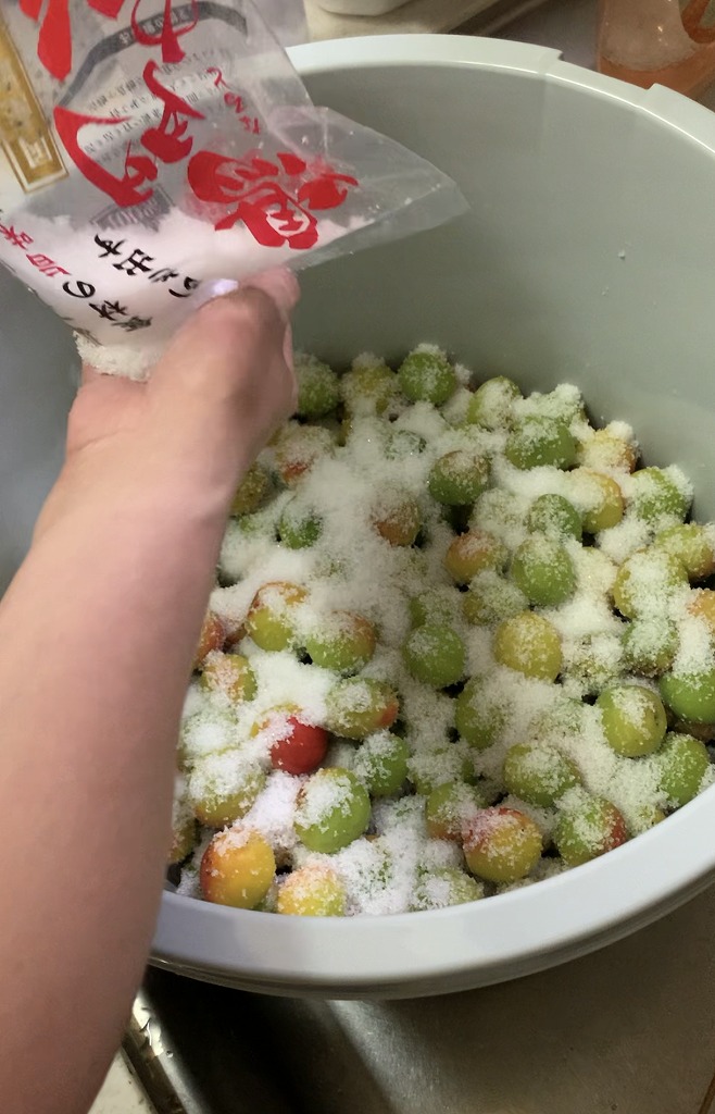 準備を整え、いよいよ作業開始です。梅はすぐには漬け込まず、2日ほど追熟させるのがポイント。青々とした梅よりも、少し黄色がかり柔らかくなった実の方が梅干し向きだそうです。二日後、部屋に漂う甘い香り。食べたくなるほどいい匂いですが、そのまま食べてはいけません。青梅には有毒成分が含まれています。だからこそ木に生っている青梅は動物も口にしないのですね。