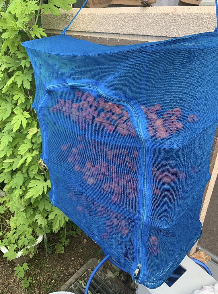 一週間後、梅から上がった梅酢でしっかり漬かっているのを確認し、下処理した赤しそを投入。さらに二週間漬け込み、梅雨明けを待って3日間の天日干しです。これが一番の山場。天気予報とにらめっこしながら、3日続けて晴れる日を待ちました。