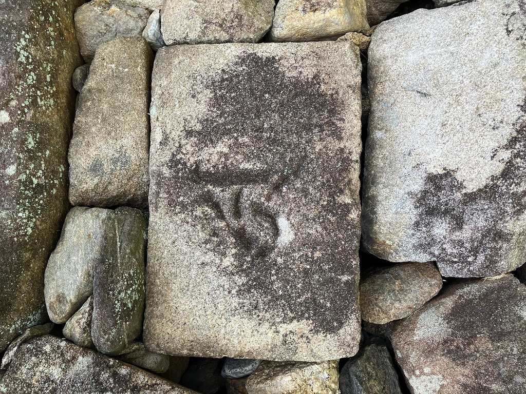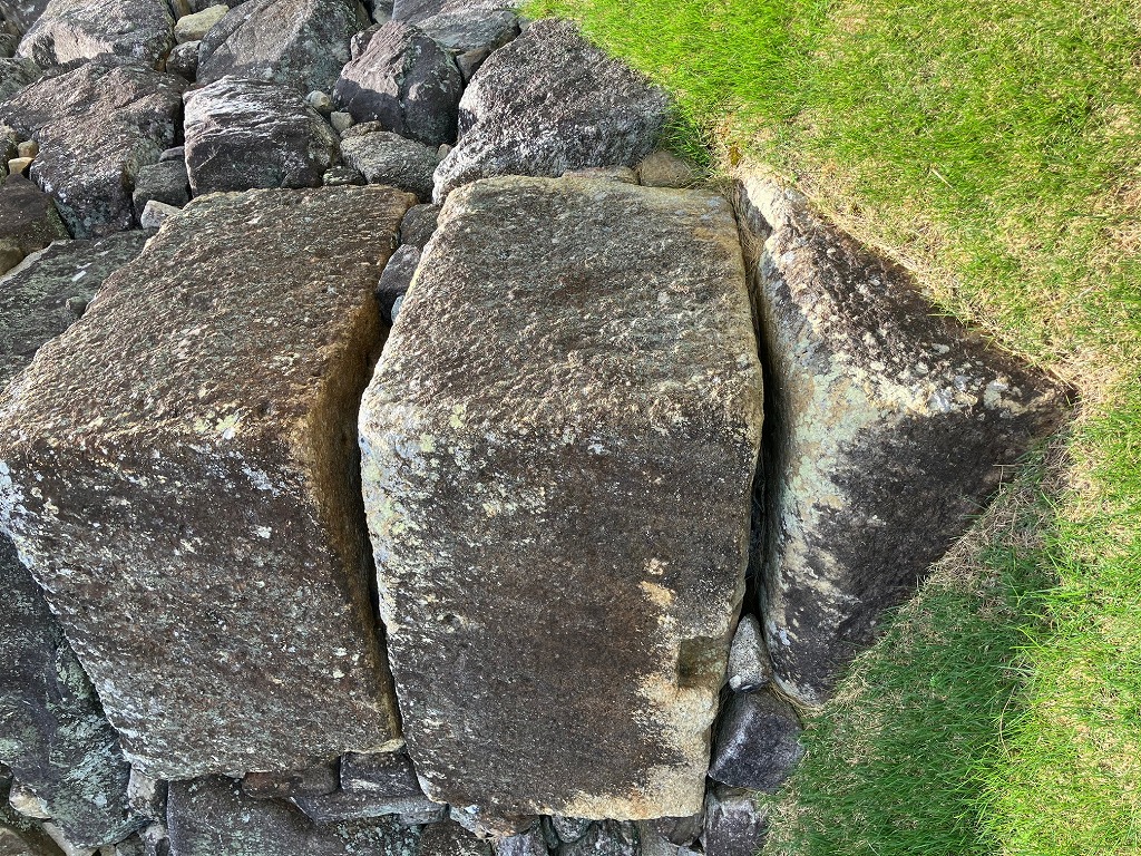 天正13年は前年の小牧・長久手の合戦で秀吉軍が家康軍に敗戦した直後であり、郡山城は大坂城に対する東の守りを固めるという重要な役割を担っていたため、城づくりは急ピッチで行われました。そのため、春日奥山や生駒山などから運ばれた自然石を基本とする野面積みの石垣には、大和各地から急いでかき集められた千以上の転用石(石仏、石塔、五輪塔、礎石、墓石など)も使われています。中でも天守台北面の逆さ地蔵や北東角の伝・平城京羅城門礎石や本丸南門跡の下方にある奈良の頭塔から運ばれた五尊石仏などは有名です。領民には一家20荷の石を持ち込むことが強制され、中には薬師寺から石が運ばれてクレームが寄せられ、秀長公が返却させたという逸話も残っています。