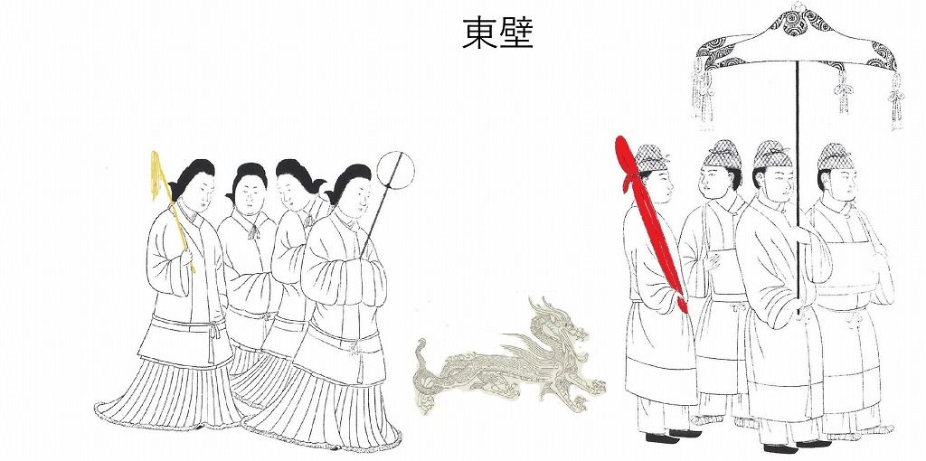 東西各8名の人物全員と四神は南の出口(閉塞石)の方角に歩いています。その並びを想いおこしてください。例えば右側の壁=東壁の男子の4名を絵の並び通りに平面的に表現して、わたしたちは説明します。