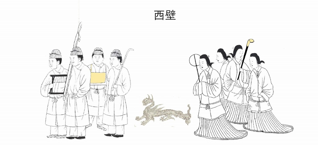 東壁男子のうしろを青龍が追いかけ、そのうしろを女子がついて歩きます。東壁女子に関しては右から2番目の女性が隊列をくずして払子を持つ女性に話しかけているような気がします。西壁男子のうしろに白虎が並んで、そのうしろに女子が歩きますが、如意を持った女性がうしろに割り込んで3列になっています。女子たちは振り返ったり、談笑したり、列を乱したりと緊張しているのか気ままなのか乱れたしぐさが伺えます。当時の生きざまが垣間見える気がします。