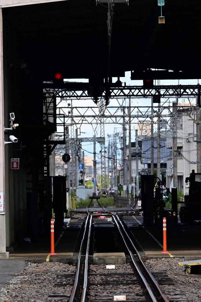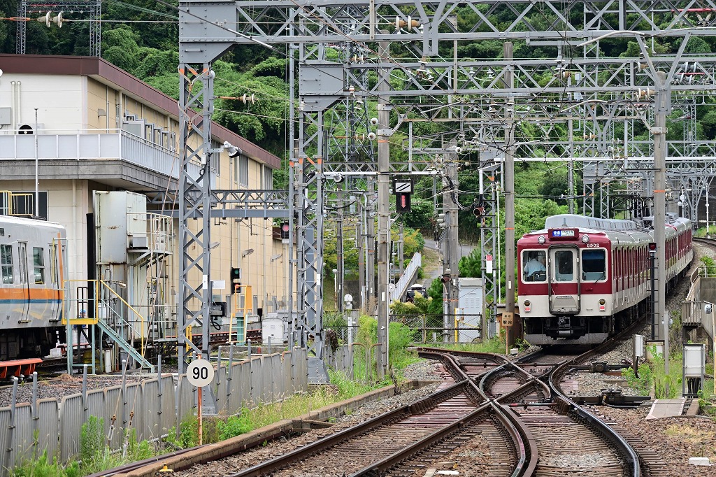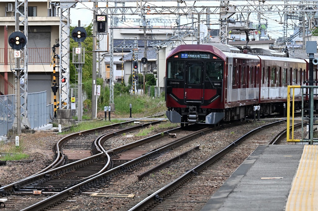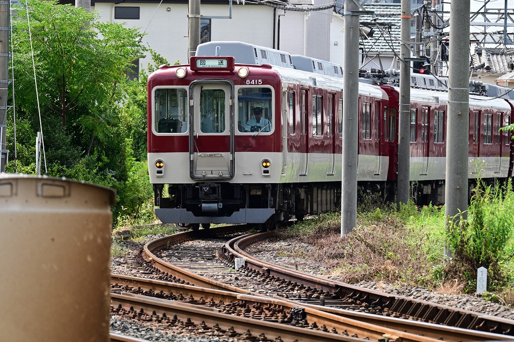 しかし仮台車では自力走行することができないので、“橿原神宮前”から“五位堂”まで専用の電車(電動貨車と言います)に前後を挟まれて回送されます。この際に通過するのが、“八木西口駅”の北側で、西側に分岐して“大和八木駅”西側で「大阪線」につながる線路。これも一般の営業車両は通りません。