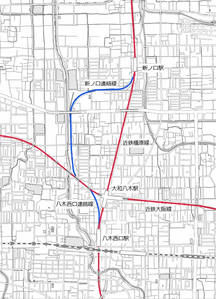 「橿原線」の“新ノ口駅”の南側で西側に分かれる線路。これは“大和八木駅”で上下に交差する「大阪線」と「橿原線」をつなぐため連絡線で“大和八木駅”の西側で高架の「大阪線」とつながります。1967年のこの連絡線の開通で、京都から伊勢志摩方面への特急が乗り換えることなく直通できるようになりました。ただし、ここを通るには特急に乗るしか方法がありません。