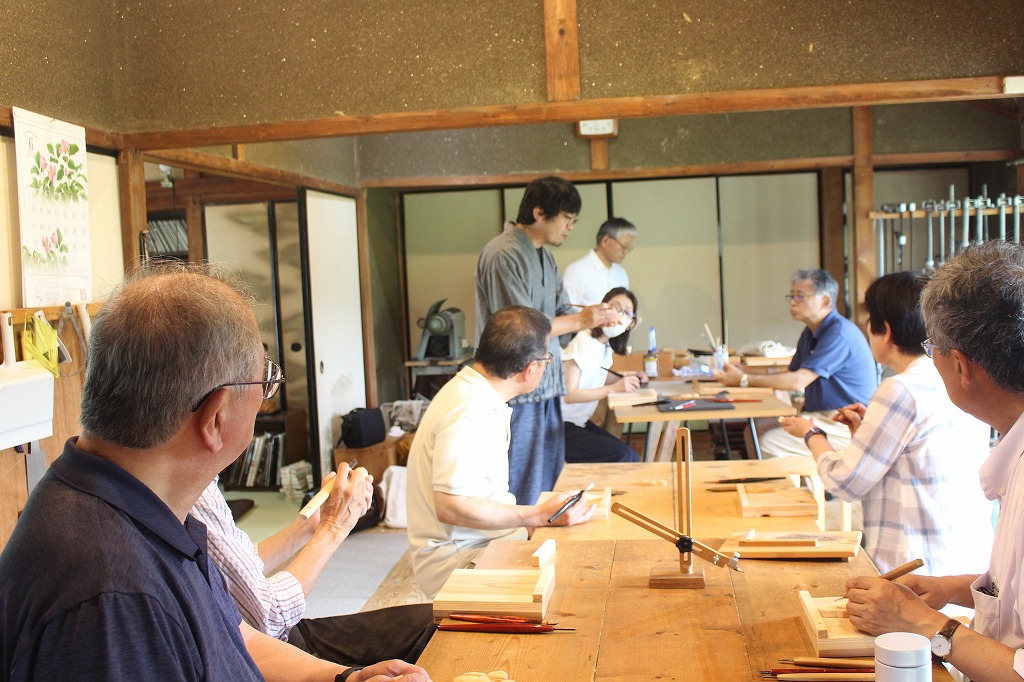啓発サークルの6月の自主勉強会は、趣向を変えて奈良仏師の折上稔史師の平群の工房において、「お地蔵さまを彫る体験講座」を実施しました。体験者は、本会会員から7名の精鋭。今回、ご指導いただいた師は、師匠筋にあたる矢野公照師とともに春日大社本殿と若宮社の狛犬計10体の新造に携った奈良仏師です。