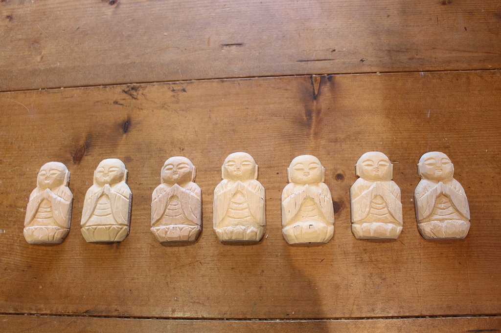 長さ約8㎝、幅約5㎝、厚さ約1.2㎝の木曽ヒノキの材に彫刻刀でお地蔵さまを彫っていきました。ちょっと手元が狂って凸部分をそぎ落としてしまうともう復元できない緊張感のなかでの緊迫した時間が流れました。