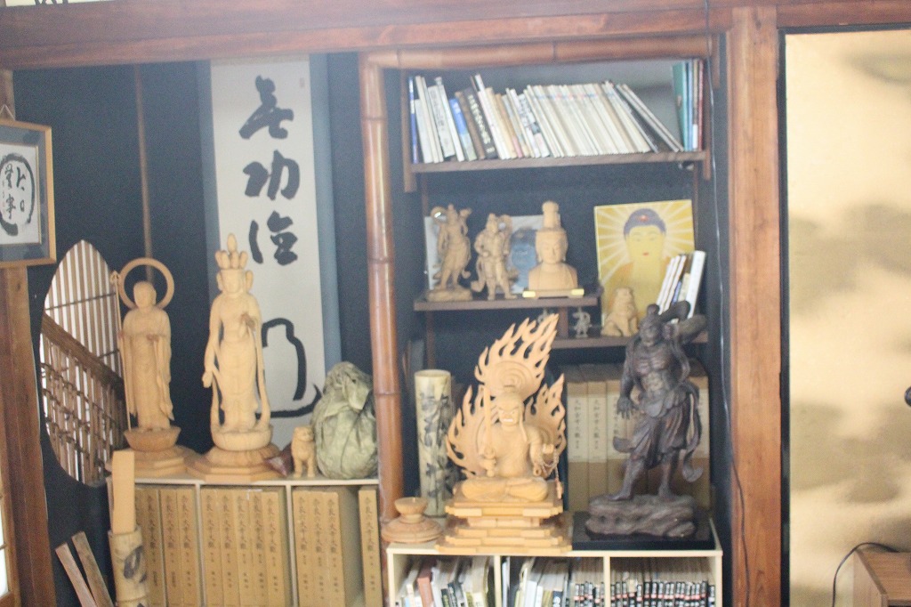 折上稔史師は芸術家(本人は職人といっておられます)なのですが、気難しいところは全くなく、極めて気さくな方で仏像などの新造や保全、修理といった本業の他に彫刻教室なども主宰しておられます。畏れ多い言い方かもしれませんが、工房には「仕掛品」が所狭と並んでいます。途中の仏様でもありがたく、参加した会員は、貴重な体験に感謝して一日を終えました。