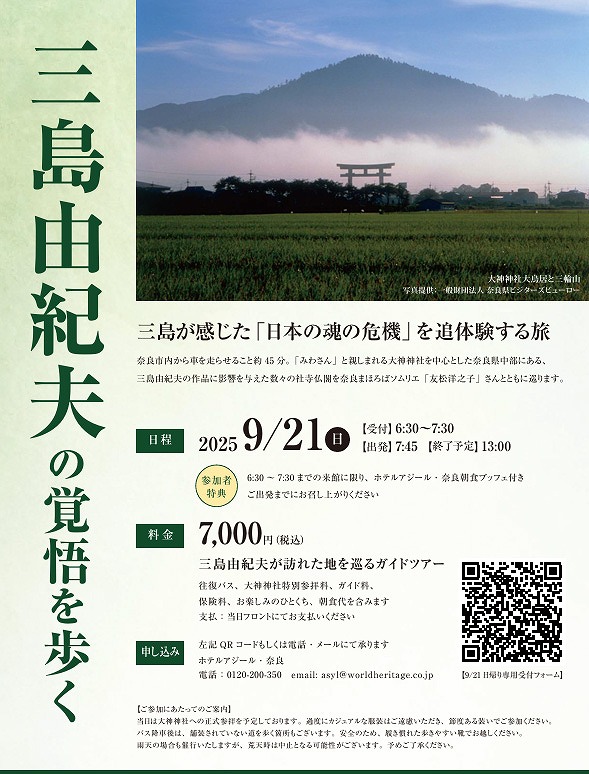 県内では、ホテルアジール・奈良(奈良市油阪町)による「三島由紀夫の覚悟を歩く」というツアーが9月21日(日)に開催されました。当日のツアーガイドと、前泊(9/20)のお客さま対象の講話の講師のご依頼をいただき、友松洋之子さん(当日のガイド)と鉄田(前日の講師)が協力いたしました(前日は、率川神社参拝なども)。