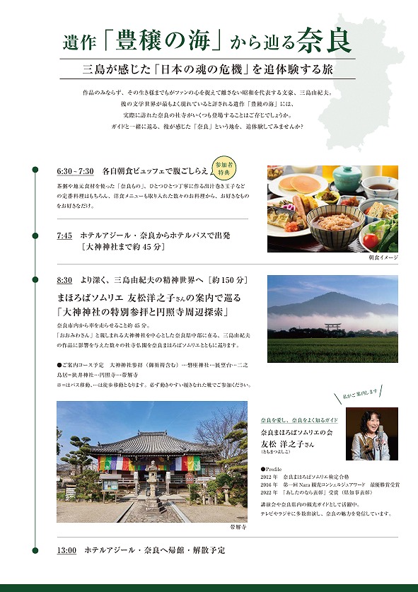 当日のツアーでは大神神社、円照寺参道、帯解寺へ(いずれも、『豊饒の海』に登場)。「三島の覚悟がよく理解できるガイドだった」と、ご好評いただきました。