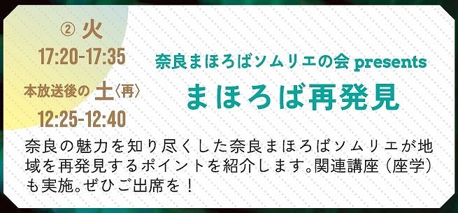 当会は開局より当会の冠番組「奈良まほろばソムリエの会 presentsまほろば再発見」というコーナーを提供しています。番組はパーソナリティのHISAさんのオープニングトーク「奈良の魅力を知り尽くした奈良まほろばソムリエが、地域を再発見するポイントを紹介。奈良検定2級合格をめざす方に向けた内容も盛り込んだ、14分です」でスタートします。