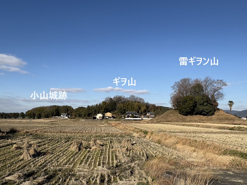 明日香村大字小山~雷にかけて、大字小山の名前の由来通り北から南に小さな山(西山、ギヲ山、雷ギヲン山、雷丘)が並んでいます。その西山の丘陵に小山城が、雷ギヲン山や雷丘にもそれぞれ砦レベルの城が建てられていました。この近くには、小山廃寺や雷北方遺跡、古宮遺跡、雷丘東方遺跡などの古代遺跡も多くあります。同じ地域に築かれた中世の砦の乱立も古代の人と同じ考えによる必然の立地だったのかも知れません。