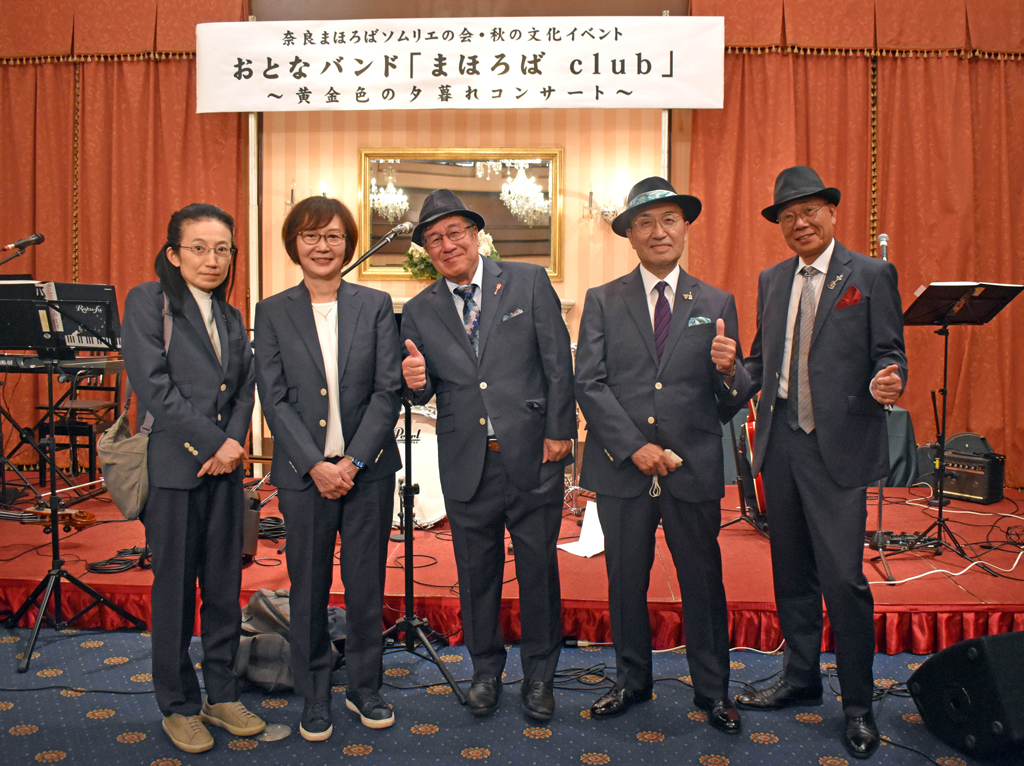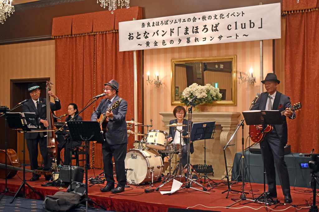 25年11月29日(土)、奈良ロイヤルホテルで、恒例の「秋の文化イベント」が開催されました。今回は、南都銀行の行員やOBらによるおとなバンド「まほろばclub」によるライブでした。ライブには22人、懇親会には21人が参加されました。ライブではメンバーによる歌と演奏のあと、全員でさだまさしの『まほろば』と坂本九の『上を向いて歩こう』を合唱しました。 まほろばclubのサイト