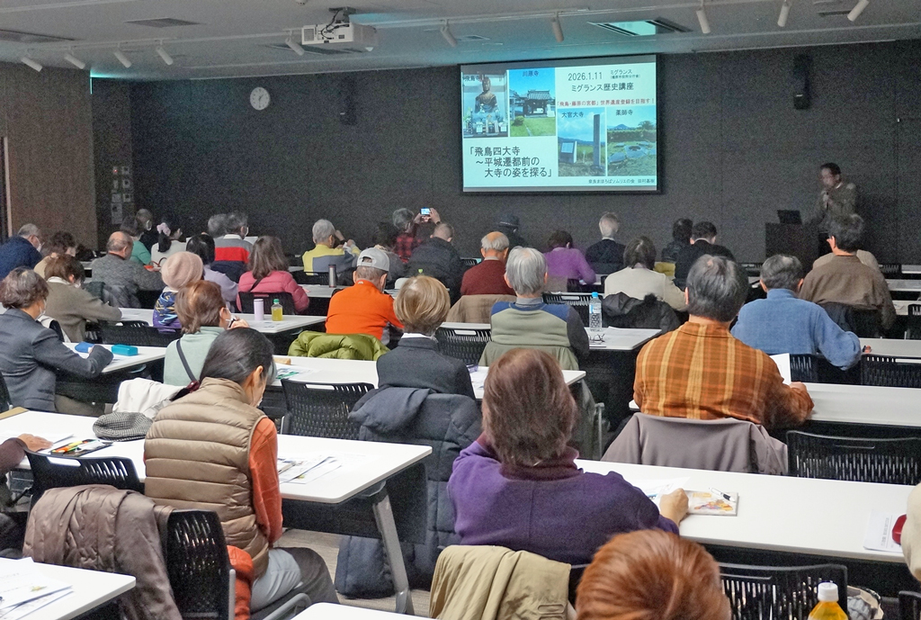 当会は、外部の講演会にも、講師を派遣しています。1月11日(日)には、橿原市役所分庁舎4階で開催される「ミグランス歴史講座」で、当会会員の田村基樹さんが「飛鳥四大寺」を語りました。