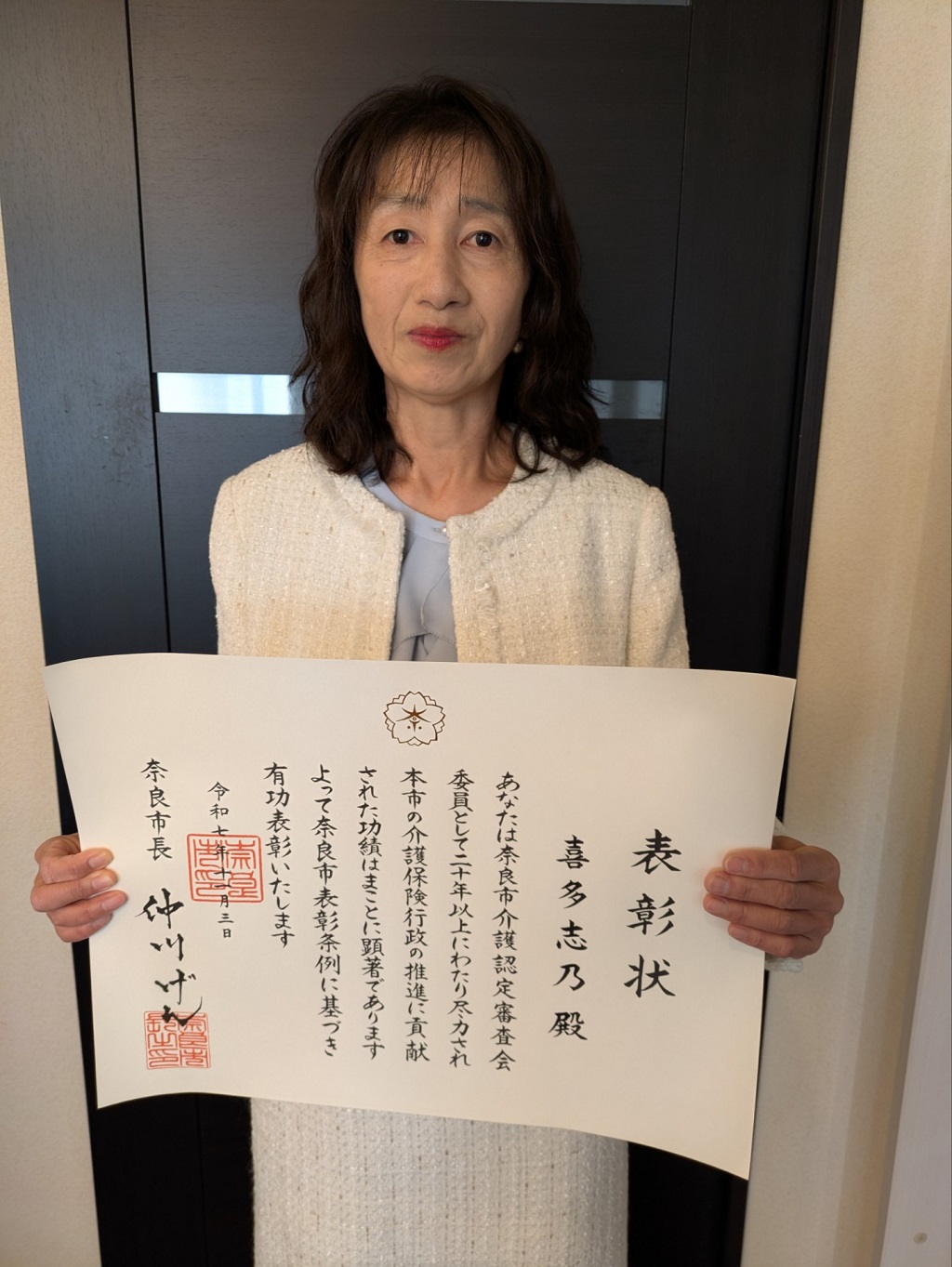 令和7年11月3日、奈良市介護認定審査会委員20年目の年に有功表彰として表彰されました。