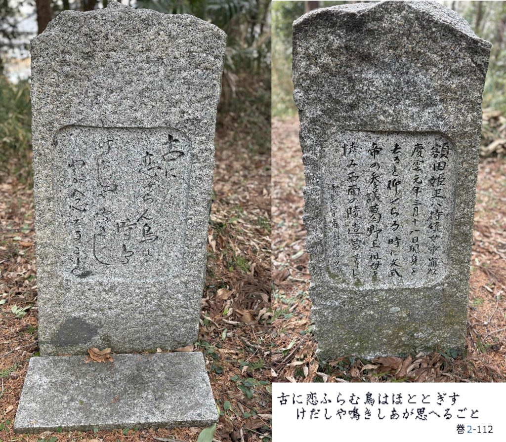 ちなみに、高松塚の近くにも平田城跡があります。高松塚壁画館から北に向かった見晴らしの良い広場が平田城跡と言われています。何の記録もありませんが、郭とおぼしき台地状の広場が数個並んでいます。また、天武持統天皇陵(野口王墓)の道を挟んで東側に野口植山城や野口吹山城があります。ここにある野口植山古墳は額田王の墓と伝わり、額田王の歌碑も立てられています。古代の遺跡のすぐ隣に中世の城跡があるのも飛鳥の面白い魅力かも知れません。(民宿脇本さんに連絡を入れると、野口植山城跡(野口植山古墳)の上までご案内いただけます)