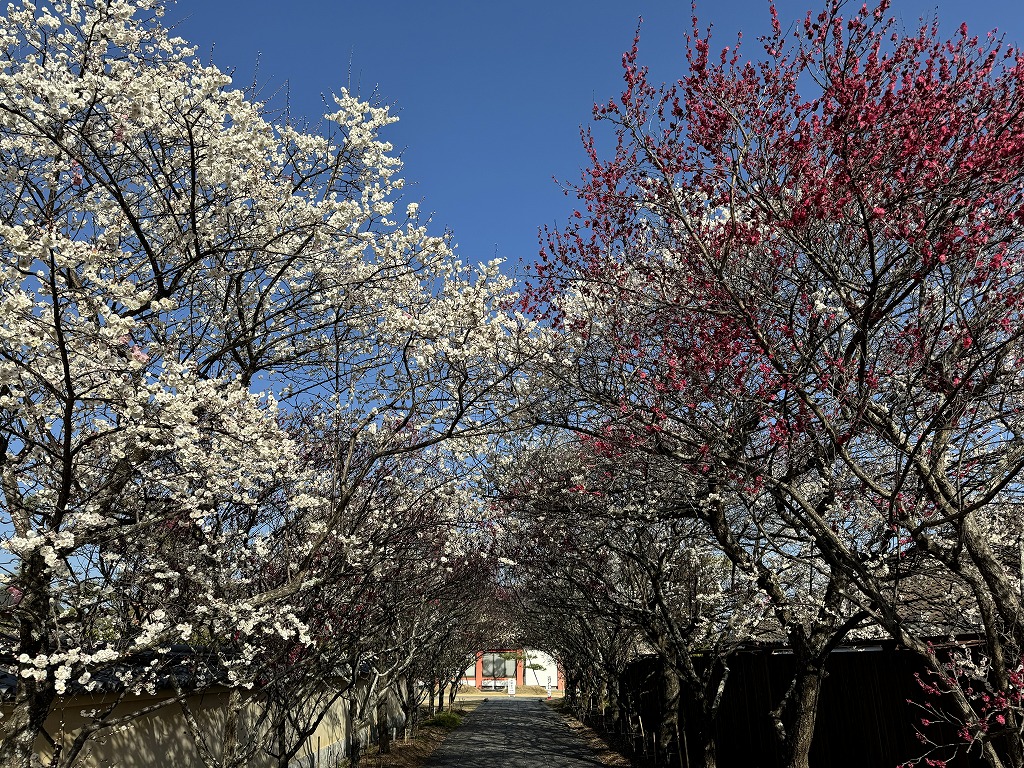 梅は春の訪れを告げる花として、万葉集をはじめとする多くの歌に詠まれてきました。薬師寺の境内には、約10種・100本の梅の木が植えられており、伽藍の朱色との対比が印象的です。お写経道場へと続く参道には梅のトンネルがあり、紅梅と白梅のグラデーションが楽しめます。また、境内で収穫された梅の実を使った「薬師寺の梅」も販売されています。(礒兼 史洋)