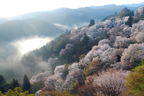吉野と桜の結びつきは古い。7世紀後半の天智天皇の時代、役小角(えんのおづぬ)が大峰山で修行中、祈りによって現れた蔵王権現を桜の木に刻んで本尊にしたのが始まり、との伝承もある。神木として手厚く保護され、平安時代ごろから苗木の寄進も盛んに行われ、国内屈指の桜の名所になった。