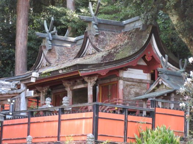 本殿は、江戸時代前期に造られ、檜皮葺(ひわだぶき)。一見すると、切妻屋根を持ち、正面の柱が4本で、間口が三つある「三間社流造(さんげんしゃながれづくり)」(一間は約1・8メートル)に見えます。しかし、よく見ると、平面的には独立した2棟の建物が並列しています。それぞれが春日大社(奈良市)に代表される建築様式で、間口が一つの「一間社春日造(いっけんしゃかすがづくり)」であり、これらを覆う流造の屋根を架けているのです。2棟それぞれの上に三角形の千鳥破風(ちどりはふ)を設けており、建物と屋根の間は吹き抜けです。このような構造は全国的に珍しく、県指定文化財となっています。