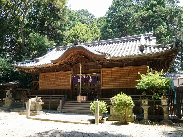 本殿(重文)は、檜皮葺の屋根で、三間社切妻造(さんげんしゃきりづまづくり)の一間向拝付(いっけんこうはいつき)(正面の柱間が三つあり、真ん中の屋根が前に伸びた建築様式)で桃山時代の装飾が施されています。