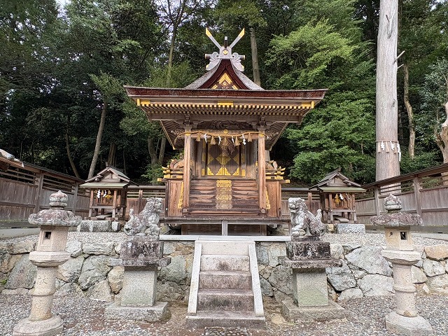 拝殿の奥に本殿、その左右に境内社が鎮座します。本殿は春日造、屋根は桧皮葺(ひわだぶき)で、千木(ちぎ)や鰹木(かつおぎ)が設けられています。境内社は伊勢神社と春日神社で、いずれも春日造。伊勢神社には天照大神が祀られています。本殿の横には神木と遥拝所があり、ここから伊勢方向を拝むことができます。