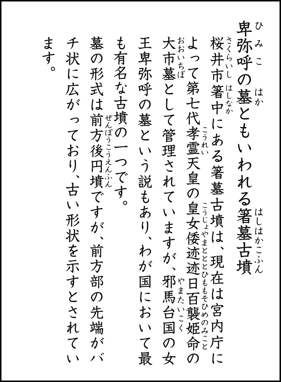 「姫は三輪山の神、大物主神(おおものぬしのかみ)の妻となったが、夫が小蛇(こおろち)であることを知った。驚いて、夫に恥をかかせてしまったと、その場に、どすんと座り込んだ。その時、箸が姫の体を突いてしまい、姫は亡くなった。姫の墓は、昼は人が造り、夜は神が造った。大坂山から墓まで列をなして石を手渡しで運び、出来上がった墓を箸墓と名付けた」