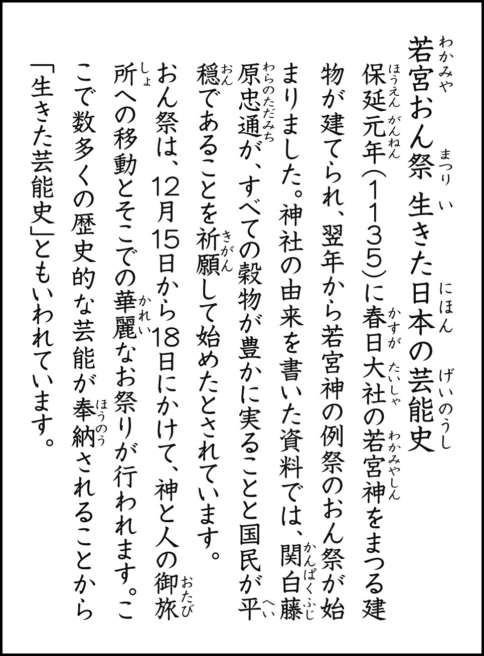 奈良の人々にとって、春日若宮おん祭は年末の大きな楽しみです。春日大社若宮神社のこの祭礼は、平安時代の保延2(1136)年に関白、藤原忠通(ただみち)が五穀豊穣と国民安寧を祈願して始めたとされます。連綿として続いており、国の重要無形民俗文化財に指定されています。