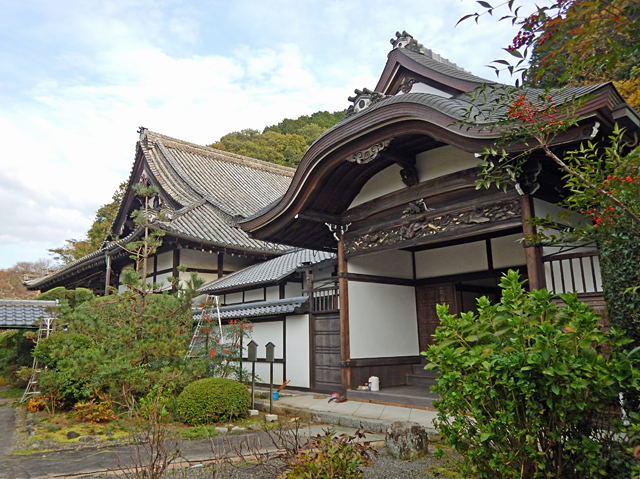 国道169号を大淀町から吉野町に入ると、吉野川の南岸に立派な建物が見えてきます。背後は山なので奥行きは浅いですが、吉野川を堀に見立て、武者返しの石垣と高い塀を設けた城郭寺院の形をしています。それが飯貝御坊(いいがいごぼう)と呼ばれる本善寺です。
